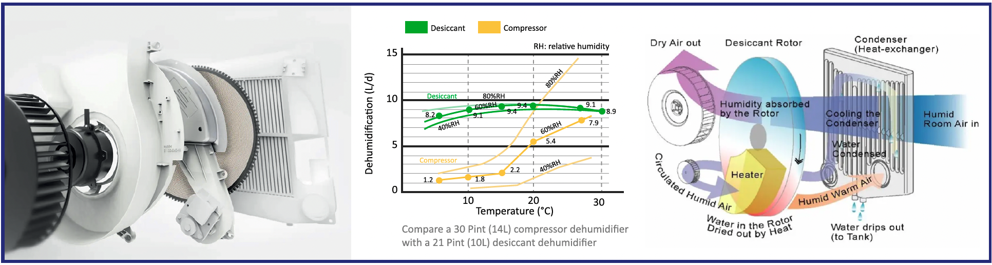 El rotor desecante absorbe la humedad en el aire. La humedad en el rotor se evapora luego por un calentador y se condensa a través de un condensador a temperatura ambiente. A diferencia de los deshumidificadores tradicionales, el rotor desecante trabaja sin compresor, permitiendo operar desde 1°C hasta 40°C.